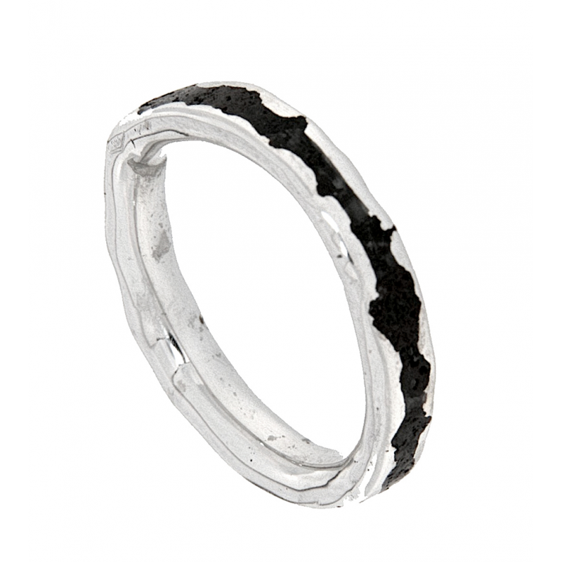 La fede è interamente realizzata a mano, il profilo tra la lava e il metallo è irregolare, per questo motivo l'anello acquistato non è uguale alla foto pubblicata, ogni qual volta viene realizzata la fusione il metallo avvolge la lava in modo diverso.